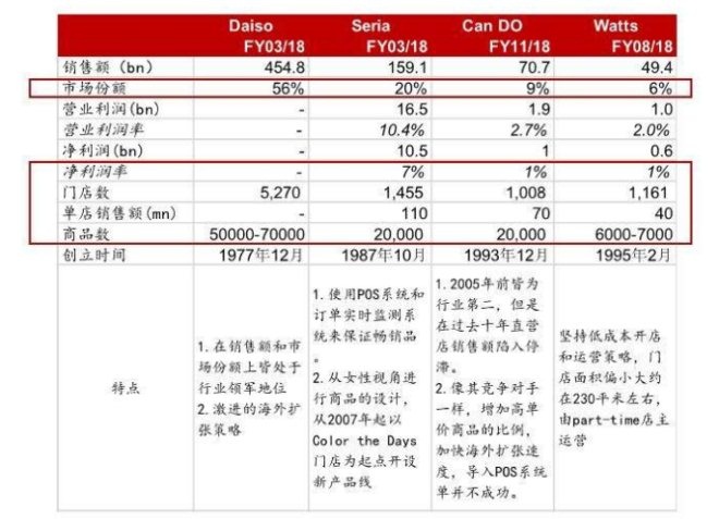 2000 年左右,因为日本百元店的上游供应渠道多在海外,日元贬值使得原材料价格上涨,百元店又是薄利多销的逻辑,所以当时死了一大批小的百元店公司,进行了一次行业洗牌。现在整个日本百元店的市场格局是:大创、Seria、Cando 和 Watts。其中大创占了约 60% 的市场份额,可以说是一家独大。