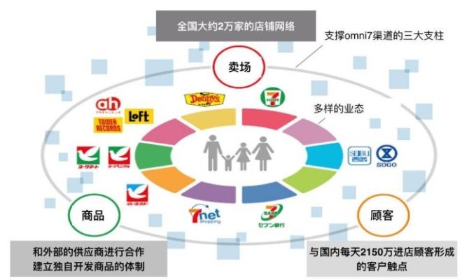 7-11 从 2005 年开始就进行各种业态整合,设立自己的控股子公司。它旗下除了便利店外,已经有多种业态:比如有西武百货店、Loft 专门店,还有 Super market 和金融业务等。如下图所示,业态整合后的 7-11 ,已经形成了一个大的战略闭环。