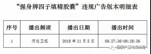 二、“力补金秋胶囊”和“强身牌四子填精胶囊”部分版本广告,含有宣传“益气固本、滋阴壮阳”、主治“阳痿不坚、遗精早泄”以及“补肾填精”等内容,存在违规播出提高性功能药品广告的问题。