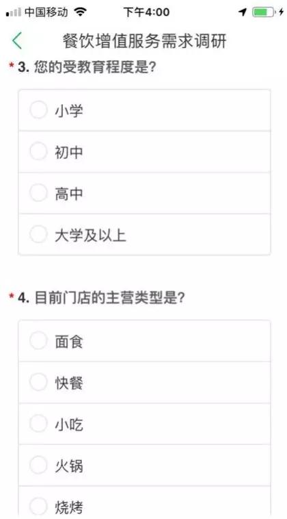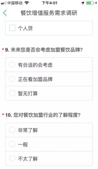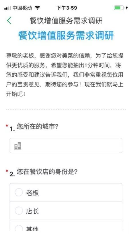 在美菜网悄悄发布的一份餐饮增值服务需求调研表里,亿邦动力了解到,该餐饮增值服务主要是做餐饮品牌的加盟业务,此外还包括店面转租业务和针对个人的贷款业务。调研内容包括用户所在城市、目前经营门店的种类、经营模式、对餐饮加盟了解程度、意向加盟餐饮种类和加盟金额等。调研表具体如下: