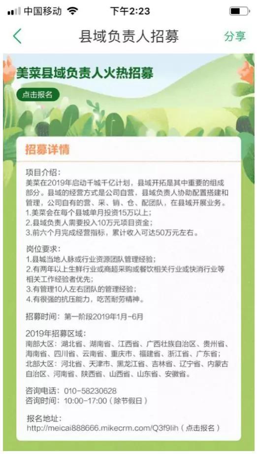 除了上述业务外,美菜还于今年启动了“千城千亿”计划,大力招募县域负责人,旨在建立以县一级为核心的运营体系。目前,该招募宣传页持续挂在美菜app上。美菜表示,县域经营方式是公司自营,美菜会在每个县城单月投资15万以上。