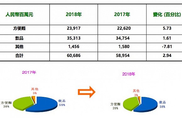 康师傅方便面业务去年收益为239.17亿元,同比成长5.73%,占集团总收益39.41%,这得益于容器面和高价袋面的正向增长,尽管干脆面出现了23.92%的下滑,不过该项品类在整个方便面份额中占比仅为1%,亏损被抵消。