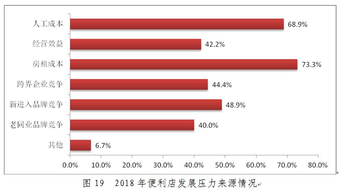 门店用工费用方面,2018年56.3%的门店用工费用小幅上涨,17.1%的门店用工费用出现了大幅上涨,便利店属于劳动密集型行业,用工费用的上升,会进一步挤压盈利空间,进一步加大门店运营的压力。