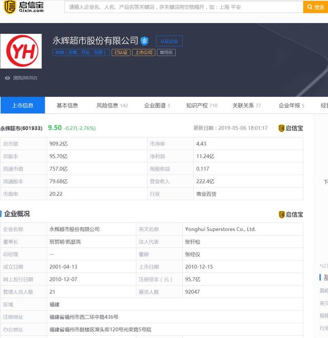 但是,大家不要忘了,这次永辉的财报是不包括其新零售核心业务的,去年永辉就已经把自己的新零售业务整个剥离出去。财报数据显示已于2018年年末被拆分的永辉云创2018年营收增长明显,达到21.46亿,同比增长283%。但目前仍处于持续亏损状态。根据启信宝的数据显示,截至2019年5月6日收盘,永辉的股价是9.5元,永辉的总市值是909.2亿元。