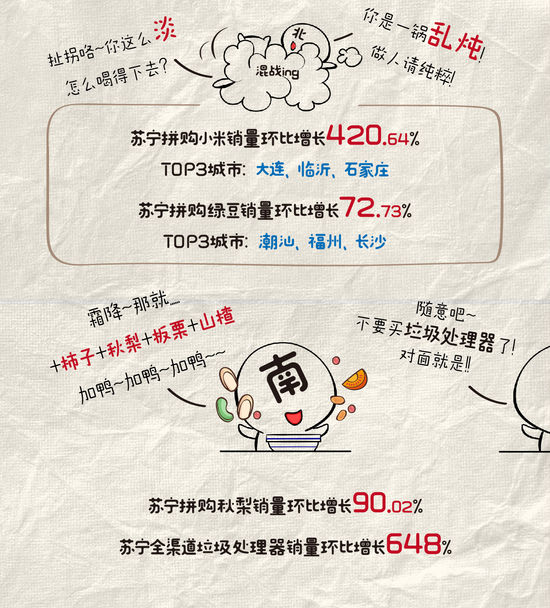 与北方喜欢单煮小米粥不同,南方人更爱加料粥。苏宁双11大数据显示,潮汕、福州、长沙人爱买绿豆,广州、长沙、芜湖人爱加皮蛋,南京、徐州钟爱秋梨。