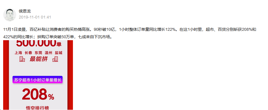 龙商网超市周刊消息: 11月1日,2019年双十一大幕正式开启。 11月1日凌晨,苏宁易购总裁侯恩龙更新微头条,公布 双十一全民嘉年华1小时战报。数据显示:今年双十一消费者买买买的热情高涨,1分30秒时已破10亿,一小时整体订单量同比增长122%。 在着重发力的...