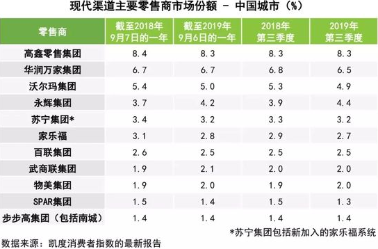 从一年的市场份额数据来看,截至2019年第三季度,市场份额前三的零售商分别为高鑫零售集团、华润万家集团和沃尔玛集团,高鑫零集团售占比达到8.3%,华润万家集团占比6.7%,沃尔玛集团占比5.0%。