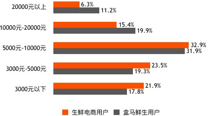 图3 2018年中国生鲜电商及盒马鲜生用户月收入情况占比