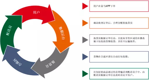 另外,盒马建立起独具特色的自动分拣系统及仓配售一体系统,在店内设置约300平米的合流区,通过自动化物流体系可以做到货物从接单、分拣、配货、出货,全程不超过10分钟,这一全流程的自动化也为盒马的快速配送能力提供了有力支撑。