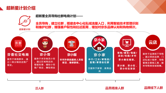 超新星计划将内容与社群融为一体,兼具资源整合优势和社交属性,通过“芬香”、“京小服”、“云店”等小程序建立以品牌导购和宝妈、退伍军人、物流小哥等为KOC的社群,搭建去中心化流量入口,并利用智能技术管理和维护社群,不仅增强了客户黏性、拉近了距离,也为品牌拓展了新的商业场景。