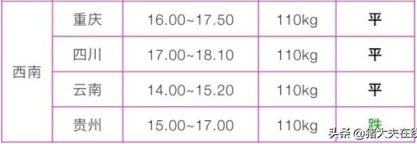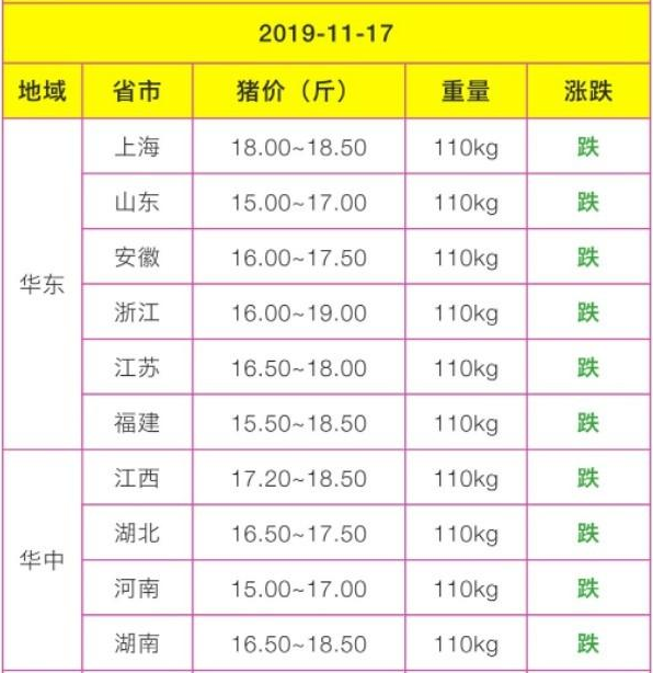 11月17日猪价,除海南外,猪价已全部下跌至20以下,广东最高也不到20,很多地区跌幅超2元,比如京津、东北等地,可以说猪价是一泻千里! 猪价一跌再跌,一泻千里,屠企报价更是直刺人心,北方加速出栏,冻肉也继续增加,南方受北方不断下跌的影响,猪价也难...