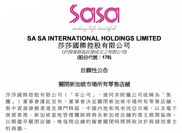 莎莎国际宣布关闭新加坡市场的所有零售门店