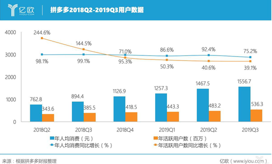 另外,拼多多2019年Q3财报显示,截至9月30日的12个月期间,拼多多平台年活跃买家数达5.363亿,较去年同期的3.855亿净增1.508亿,同比增长超过39.12%,较上一季度净增5310万,创上市以来最大单季增长。淘系同期为6.93亿,京东为3.344亿。正在逼近淘系。