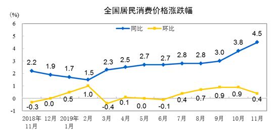 从同比看,CPI上涨4.5%,涨幅比上月扩大0.7个百分点。其中,食品价格上涨19.1%,影响CPI上涨约3.72个百分点;非食品价格上涨1.0%,影响CPI上涨约0.77个百分点。食品中,鲜果价格继续下降6.8%,降幅比上月扩大6.5个百分点;水产品价格上涨2.4%,涨幅比上月回落0.3个百分点;鲜菜价格由上月下降转为上涨3.9%;猪肉价格上涨110.2%,牛肉、羊肉、鸡肉、鸭肉和鸡蛋价格涨幅在11.8%—25.7%之间。非食品中,医疗保健、教育文化和娱乐、衣着价格分别上涨2.0%、1.7%和1.1%。交通和通信价格下降2.8%;其中,汽油和柴油价格分别下降10.8%和11.3%。据测算,在11月份4.5%的同比涨幅中,去年价格变动的翘尾影响约为0,新涨价影响约为4.5个百分点。