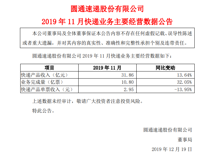 圆通速递发布公告称,11月快递产品收入31.86亿元,同比增长13.64%;业务完成量10.80亿票,同比增长32.05%;快递产品单票收入2.95元,同比下降13.95%。