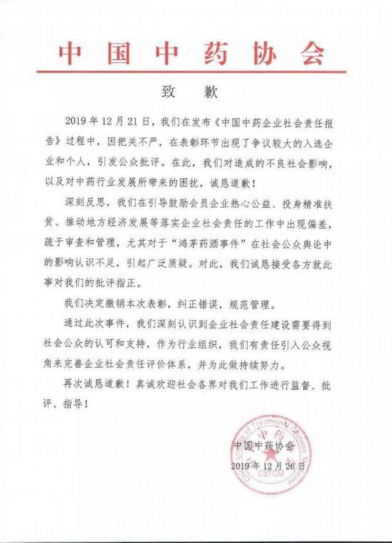 据经济日报-中国经济网报道,12月26日,中国中药协会发布致歉函称,2019年12月21日,该协会在发布《中国中药企业社会责任报告》过程中,因把关不严,在表彰环节出现了争议较大的入选企业和个人,引发公众批评。“我们决定撤销本次表彰,纠正错误,规范管理。”