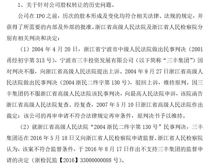 其次,针对2002年4月公安机关立案侦查的内容未披露、2004年宁波市北仑区法院撤销2002年的判决书两项问题均作出解释,并声明三江购物及实际控制人不存在报道中所述的用隐瞒、虚假的方式挪用资金、涉嫌违规低价转让股权致国有资产流失的情况。