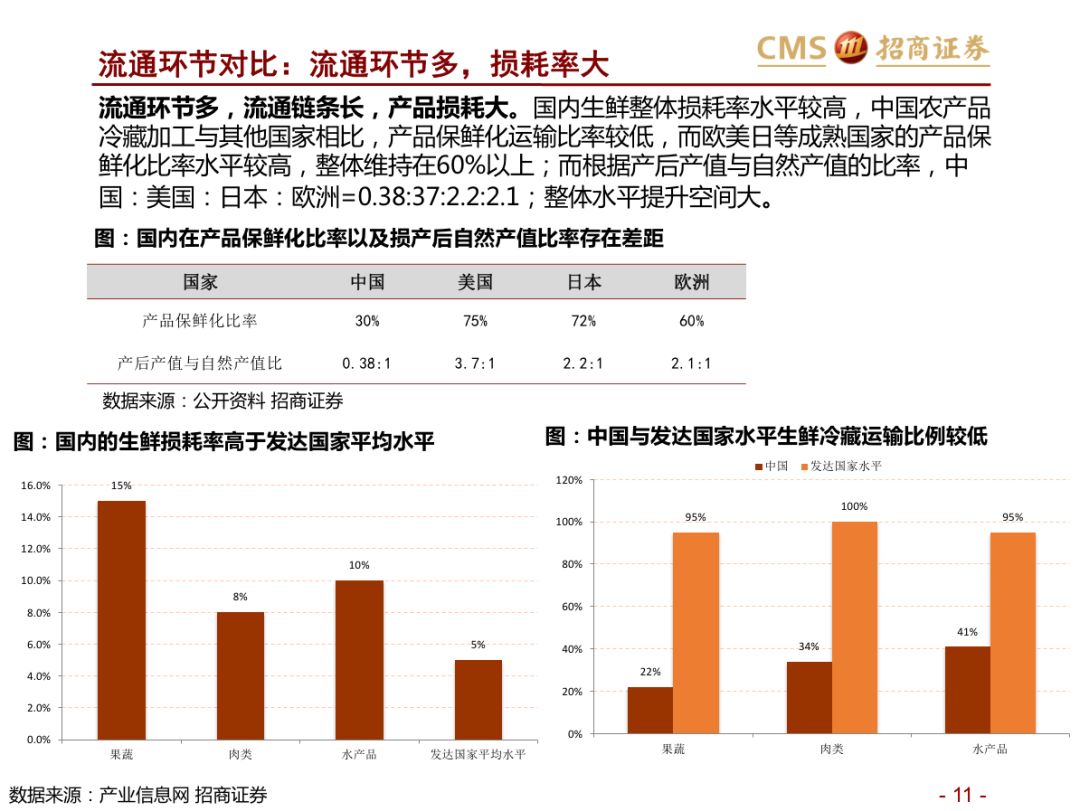 商品端:倒逼供应链改革,品类视角看生鲜:集中度不高、损耗率高,加价率低。生鲜不同品类生产、物流及销售管理标准化程度不一,整体来看养殖上游产业化区域集中度强于种植。生鲜核心涉及猪肉、蔬果、水产品等,猪肉上游养殖形成南北双雄,流通端基于冷链物流等,运输半径扩展,但物流和零售效率仍有待提升;水产,已经形成上游的产业化趋势,但产业集中度水平不高,产品的标准化、运输问题仍是水产的问题。蔬果,上游种植产业集中度不高,严重依赖冷链等基础设施,区域运输半径小,采购的标准化问题难以短期解决,产品损耗率高。