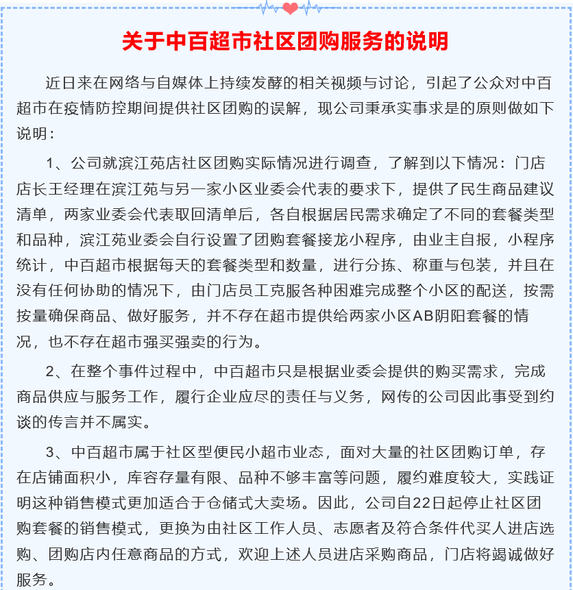 近日来在网络与自媒体上持续发酵的相关视频与讨论,引起了公众对中百超市在疫情防控期间提供社区团购的误解,现公司秉承实事求是的原则做如下说明: