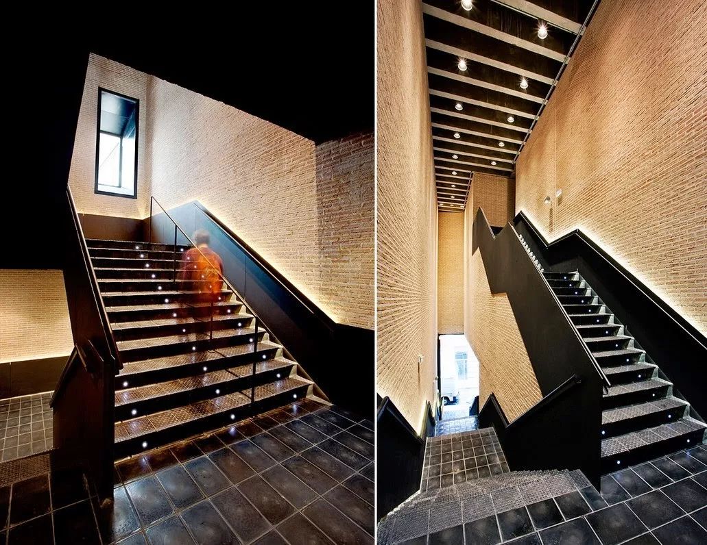 通往三层的只有楼梯,砖瓦与黑色金属材质呼应了建筑外立面。这里是马德里唯一一家位于市场屋顶的户外餐厅,不仅有国际食谱、种类繁多的鸡尾酒,还有品酒会、火腿切割大师班等有趣的研讨会。