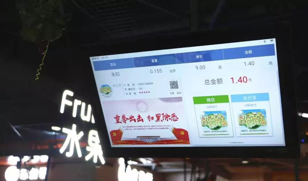 1、各家店铺统一配备智能电子称,电子显示器,商户信息,菜品信息,消费金额,电子付款二维码都将通过摊位上方显示器进行显示,支付后可以通过小票追溯菜源信息。