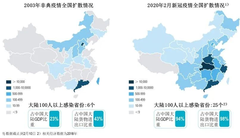 本次疫情较“非典”疫情的影响范围更大。 “非典”疫情主要疫区呈散点式分布,疫情期间有6个省份感染人数超过100人。而新冠疫情以中部省区为核心迅速蔓延,截止2月10日已经有25个省区感染人数超过100人。