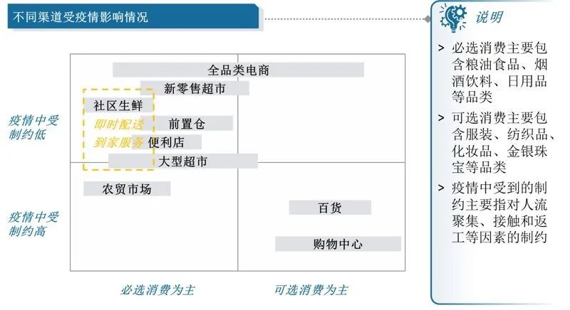 本次疫情对于不同的零售渠道的影响程度差异巨大,我们依据各渠道在疫情中受制约的程度,以及渠道承载的主要品类的属性,对各零售渠道受到的影响进行初步研判,分析疫情对不同零售渠道可能的当期影响和中长期影响。