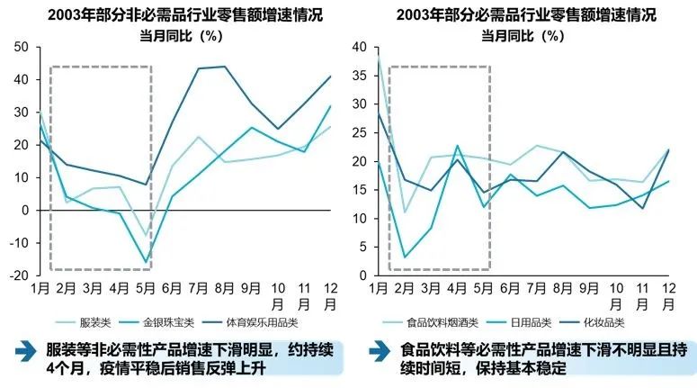 虽然有研究指出2003年虽然受到“非典”的影响,但全年的社会消费品零售总额仍在全年保持了稳定的增长,并由此对本次疫情的影响持中性态度。我们认为,除了增长率之外更应该看到规模的差异。2003年全年全国规模以上企业社会商品零售总额(消费品类)不足7,000亿,二季度不足1500亿,总量约为2019年一季度或二季度的十分之一弱。即使产生同等影响,其总量仍不容小觑。