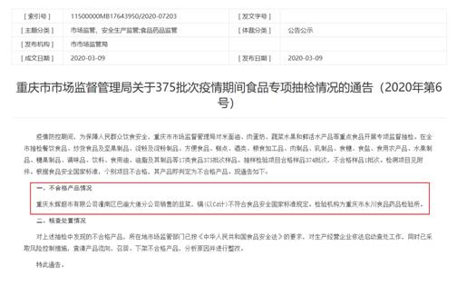 重庆市市场监督管理局官网消息称,疫情防控期间,重庆市市场监督管理局在全市抽检餐饮食品、炒货食品及坚果制品、淀粉及淀粉制品、方便食品等17类食品375批次样品。抽样检验项目合格样品374批次,不合格样品1批次。重庆永辉超市有限公司潼南区巴渝大道分公司...