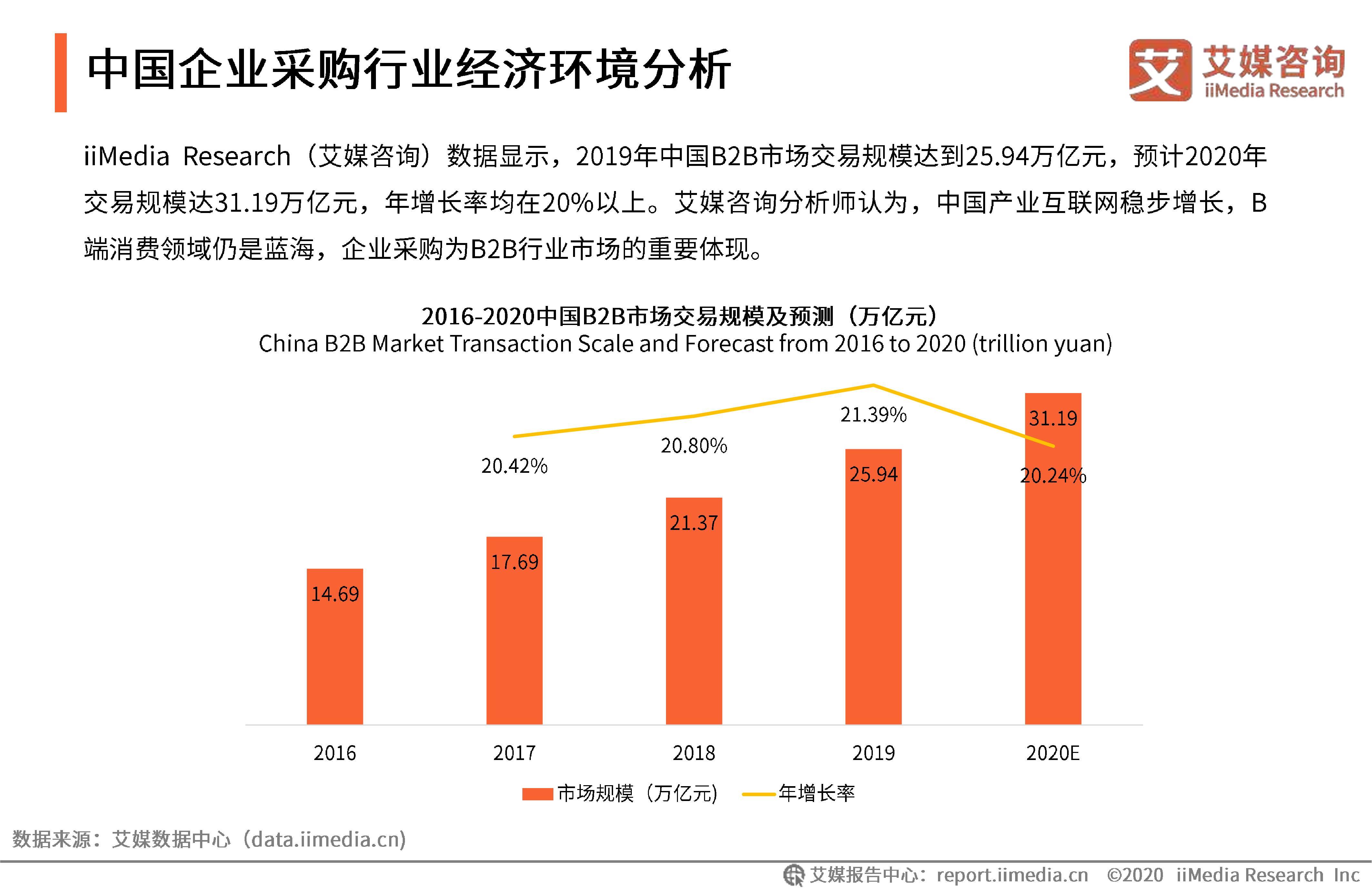 龙商网消息: 近日,艾媒咨询发布《2019-2020企业采购行业研究报告》显示,2019年中国B2B市场交易规模达到25.94万亿元,预计2020年交易规模达31.19万亿元。2019年中国超过4成企业采用线上与线下相结合的双线采购方式,其中不断完善双线运营的苏宁B2B,在2019...