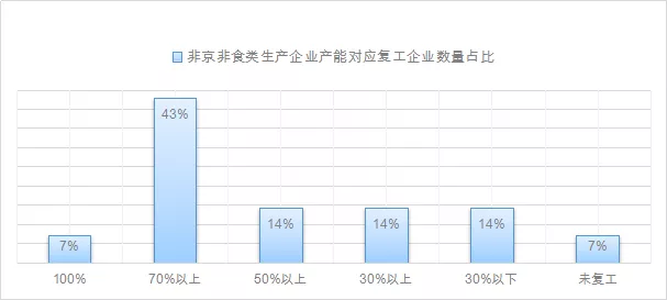 非京非食类生产企业中总体复工率也达到92%,但平均产能仅为57%。最早复工时间1月21日,其中产能达到以往正常值100%的企业占比7%、达到43%及以上的占比42%、50%以上的占比14%,30%以上的占比14%、而不足30%的占比14%,未复工企业占比7%。