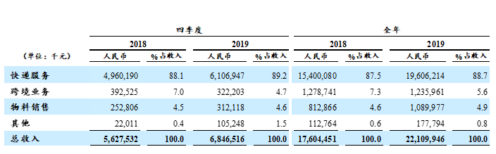 龙商网消息:中通快递发布了截至12月31日的2019财年第四季度及全年未经审计财报。报告显示,中通快递第四季度营收为68.465亿元,同比增长21.7%;净利润为23.168亿元,同比增长81.2%。