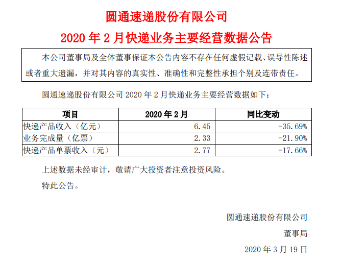 龙商网消息:圆通速递公告称,2月快递产品收入6.45亿元,同比下降35.69%。业务完成量2.33亿票,同比下降21.90%。快递产品单票收入2.77元,同比下降17.66%。
