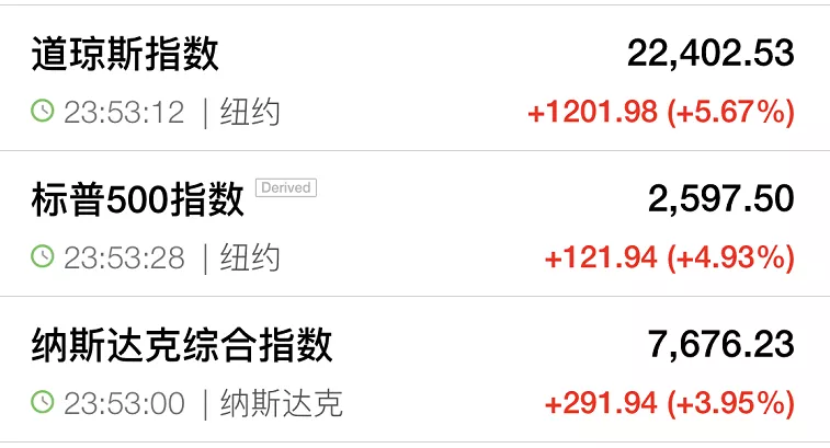 在上述声明发布之后,全球市场反应非常正面。美国股市再度大涨。截至发稿时间,道指涨幅扩大至1100点,涨幅超过5%,波音涨约16%领跑其成分股,美国运通涨超9%,可口可乐涨超8%,蓝筹股苹果涨超2%;纳指涨超4%,标普500指数涨4.8%。欧洲市场亦由杀跌转为全线翻红。