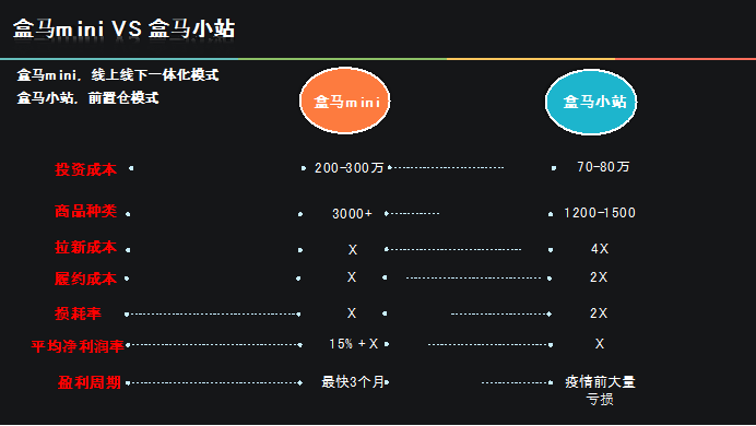 招商零售研报显示,由于多了线下门店体验,盒马mini的次月留存率是小站的一倍,履约成本也小一半;由于mini门店新客大部分来自于门店转化,人均拉新成本是小站的1/4;门店促清的效果大于纯线上,盒马mini的损耗率也比小站低了近一倍,因为损耗低,所以商品品类也几乎是后者的一倍。综上所述,盒马mini的平均每单的净利润率要比小站高15%,前者最快3个月就能盈利,而盒马小站在疫情之前基本上是亏损状态。