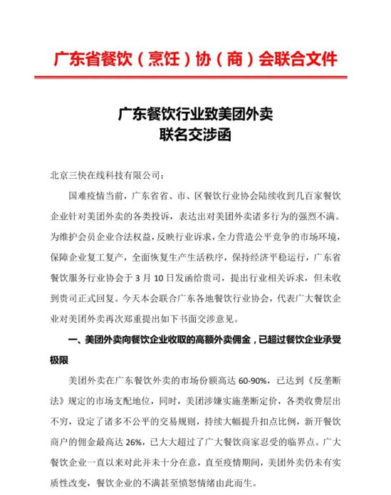 4月10日,广东省餐饮服务行业协会发布一份联合文件,文件内容为“广东餐饮行业致美团外卖联名交涉函”。