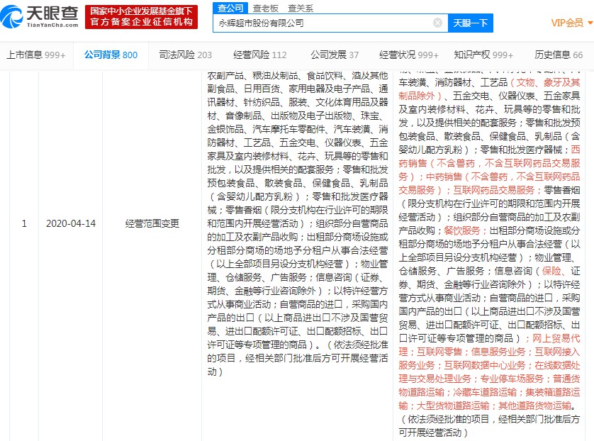 天眼查数据显示,4月14日,永辉超市的运营主体永辉超市股份有限公司发生经营范围变更,新增网上贸易代理;互联网零售;互联网数据中心业务;普通货物道路运输;冷藏车道路运输;集装箱道路运输;大型货物道路运输;互联网药品交易服务等。