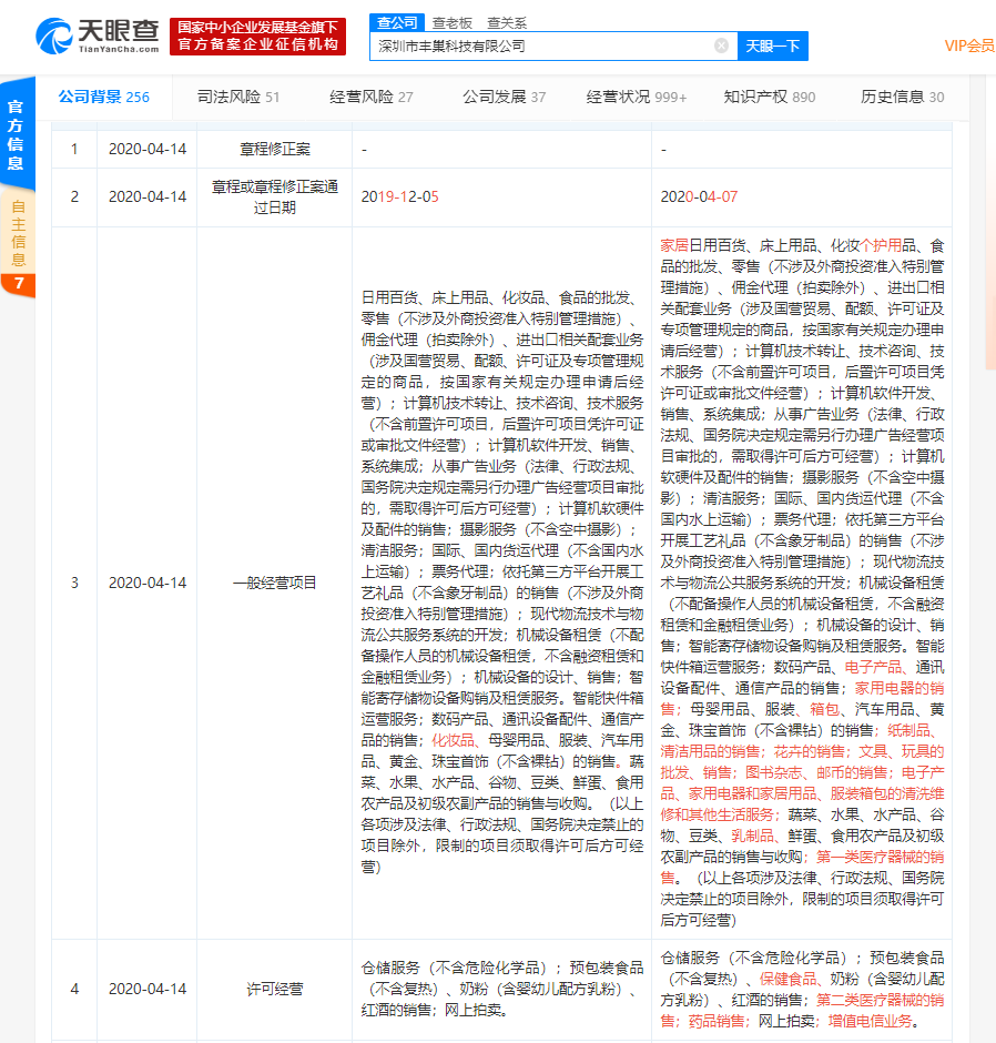天眼查数据显示,4月14日,丰巢的运营主体深圳市丰巢科技有限公司发生工商变更,其许可经营项目新增第二类医疗器械的销售、药品销售、增值电信业务、保健食品;一般经营项目新增第一类医疗器械的销售、纸制品、清洁用品的销售、花卉的销售、文具玩具的批发销售、图书杂志、邮币的销售等。