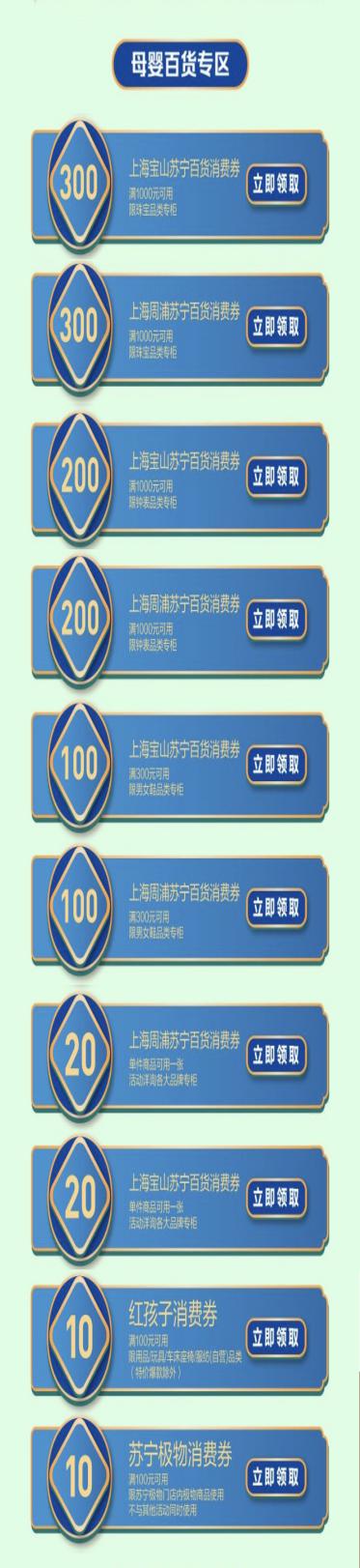 并且,该消费券在上海地区苏宁易购线下门店、苏宁红孩子、苏宁极物、苏宁帮客、苏宁百货以及苏宁线上超市都可以使用。