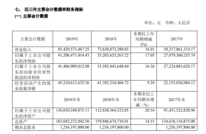 龙商网消息:贵州茅台今日发布2019年年报。数据显示,贵州茅台2019年全年实现营收854.3亿元,同比增长16%,归属于上市公司股东的净利润为412.1亿元,同比增长17.05%。