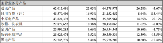 相比之下,苏宁易购来自日用百货类商品的收入增长迅猛,相关商品全年取得收入455.7亿元,同比增长115.44%,占总营收的比例从2018年的8.64%大幅增长至16.93%。