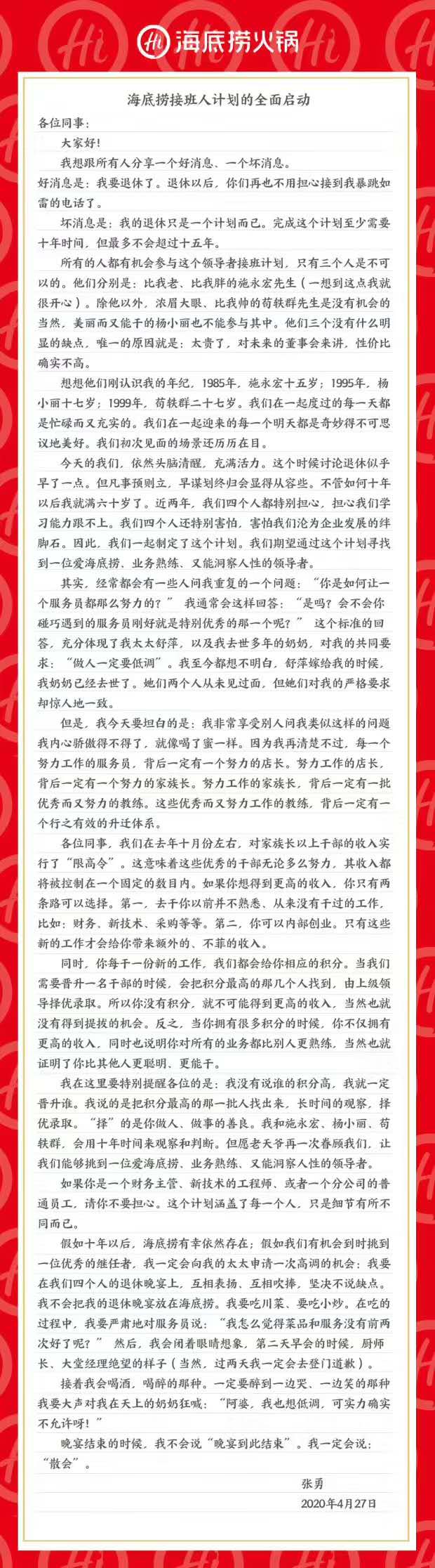 龙商网消息:海底捞创始人张勇4月27日通过公司内部邮件宣布,全面启动接班人计划。海底捞创始人张勇称,除施永宏、苟轶群、杨小丽以外的所有员工都有机会参与领导者接班计划,并表示自己将在十至十五年后退休。