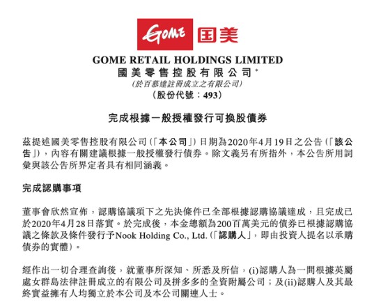 4月28日,国美零售发布公告称,拼多多2亿美元可换股债券战略投资已经完成交割手续。