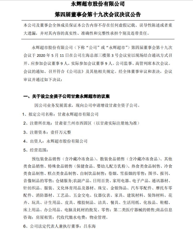 5月11日,永辉超市第四届董事会第十九次会议决议公告称,因公司业务发展需求,现向公司申请增设甘肃全资子公司,注册资本1000万元整。