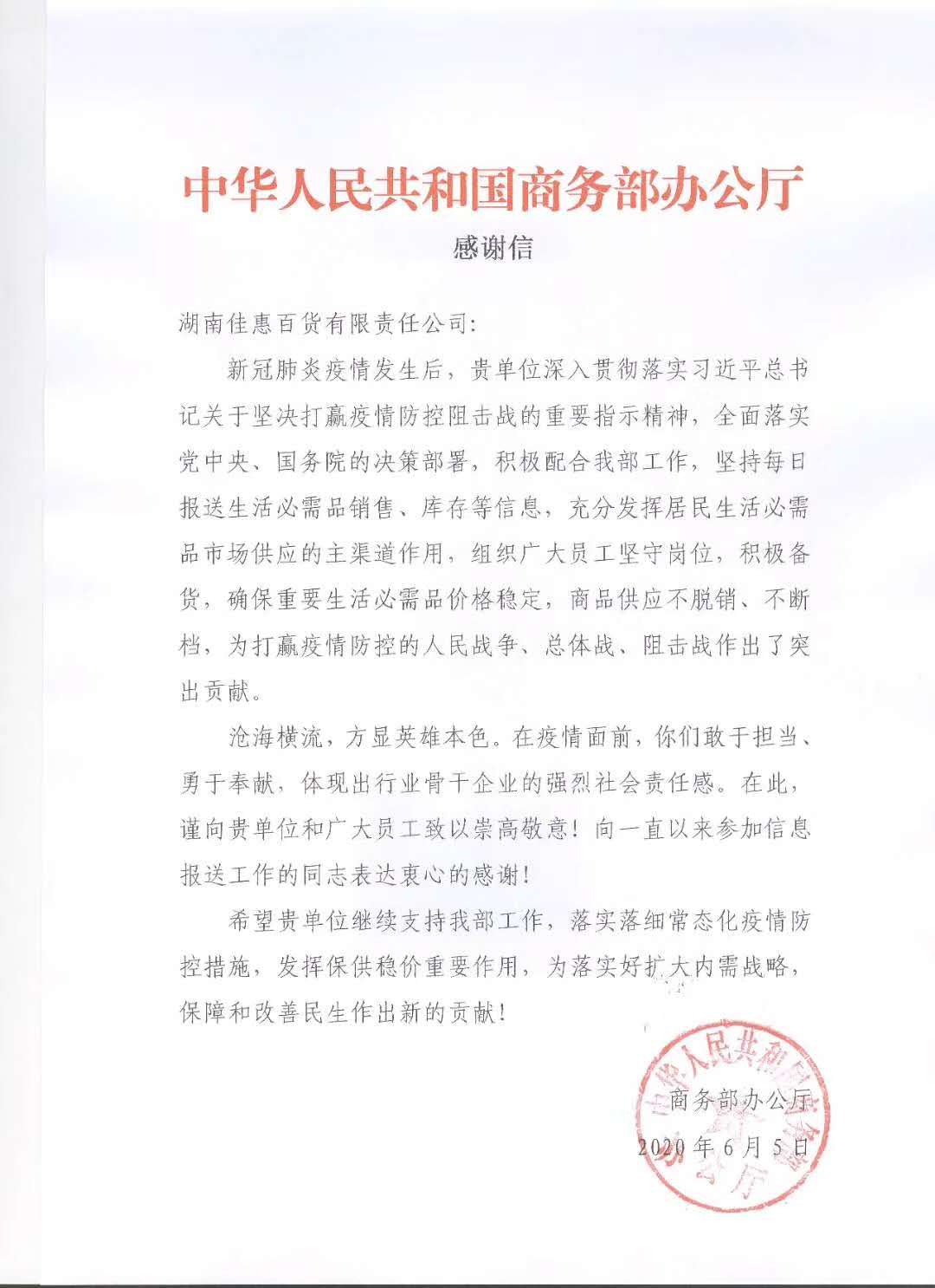 龙商网&超市周刊讯(王跃霞 北京报道)6月5日,中华人民共和国商务部办公厅(以下简称“商务部”)致信湖南佳惠百货有限责任公司(以下简称“佳惠”),对“新冠肺炎疫情期间佳惠积极配合商务部打赢疫情防控狙击战”表示感谢。