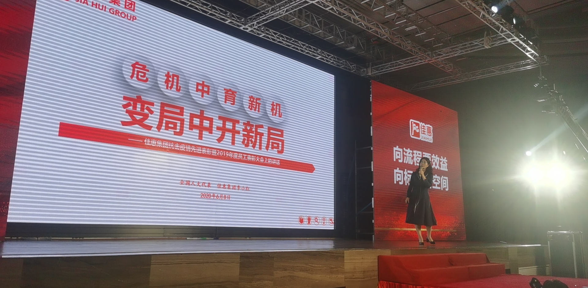 6月8日,佳惠在湖南怀化满堂彩润上兰城店举办主题为“抗击疫情 先进表彰”的2019年度员工表彰大会,本次大会在线上同步开启直播。
