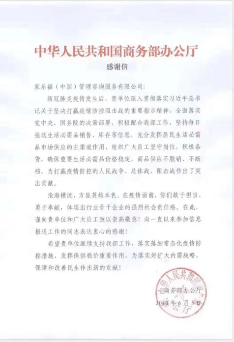 日前,苏宁家乐福收到一封沉甸甸的感谢信。信中,中华人民共和国商务部办公厅充分肯定了家乐福在疫情期间,全力发挥居民生活必需品市场供应的主渠道作用,有效保障物资供应、稳定物价,为打赢疫情战作出突出贡献。