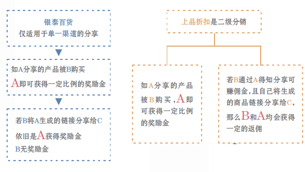 不过,银泰百货与上品折扣的模式还存在一些差异,银泰百货的用户获取奖励金到账后,需要兑换成银泰券在银泰门店与喵街App购物时抵用,而上品折扣的分销员在佣金到账后即可提现。此外,银泰百货仅适用于单一渠道的分享,如A分享的产品被B购买,A即可获得一定比例的奖励金;若B将A生成的商品链接分享给C,依旧是A获得奖励金,B无奖励金。而上品折扣则是二级分销,如A分享的产品被B购买,A即可获得一定比例的奖励金;若B通过A得知分享可赚佣金,且自己将生成的商品链接分享给C,那么B和A均会获得一定的返佣。