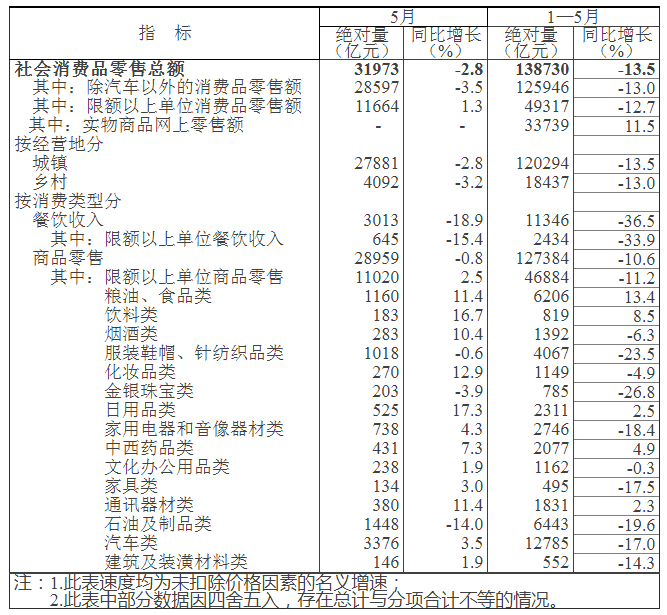 5月份,社会消费品零售总额31973亿元,同比下降2.8%(扣除价格因素实际下降3.7%,以下除特殊说明外均为名义增长),降幅比上月收窄4.7个百分点。其中,除汽车以外的消费品零售额28597亿元,下降3.5%。 15月份,社会消费品零售总额138730亿元,同比名义下降13...