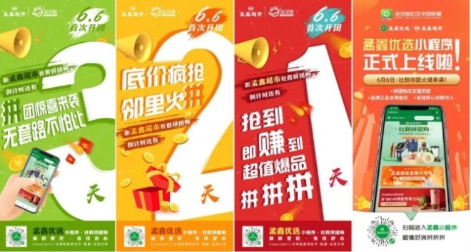 一个活动的顺利开展,不仅得益于好的商品和优质的活动,更得益于前期的造势营销,为充分打响孟鑫活动知名度,孟鑫超市在全球蛙的助力下提前布局预热宣传,商品9宫格、倒计时海报、社群商品推广等,抢鲜占领顾客认知,为活动的顺利开展打下了扎实的基础!